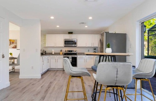 The ground floor features a Garage with Foosball Table and 2 Parking spaces. The modern kitchen is fully equipped and seamlessly blends into the open-plan living space overlooking the screened pool patio in a screened patio. Guests can relax and enjoy a movie on a large Smart TV after a day of fun. In addition to this space there a formal dining room with seating for 8 next to a round table with seating for 4, just perfect for all types of occasions and family get-togethers.