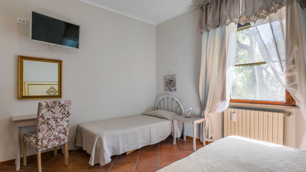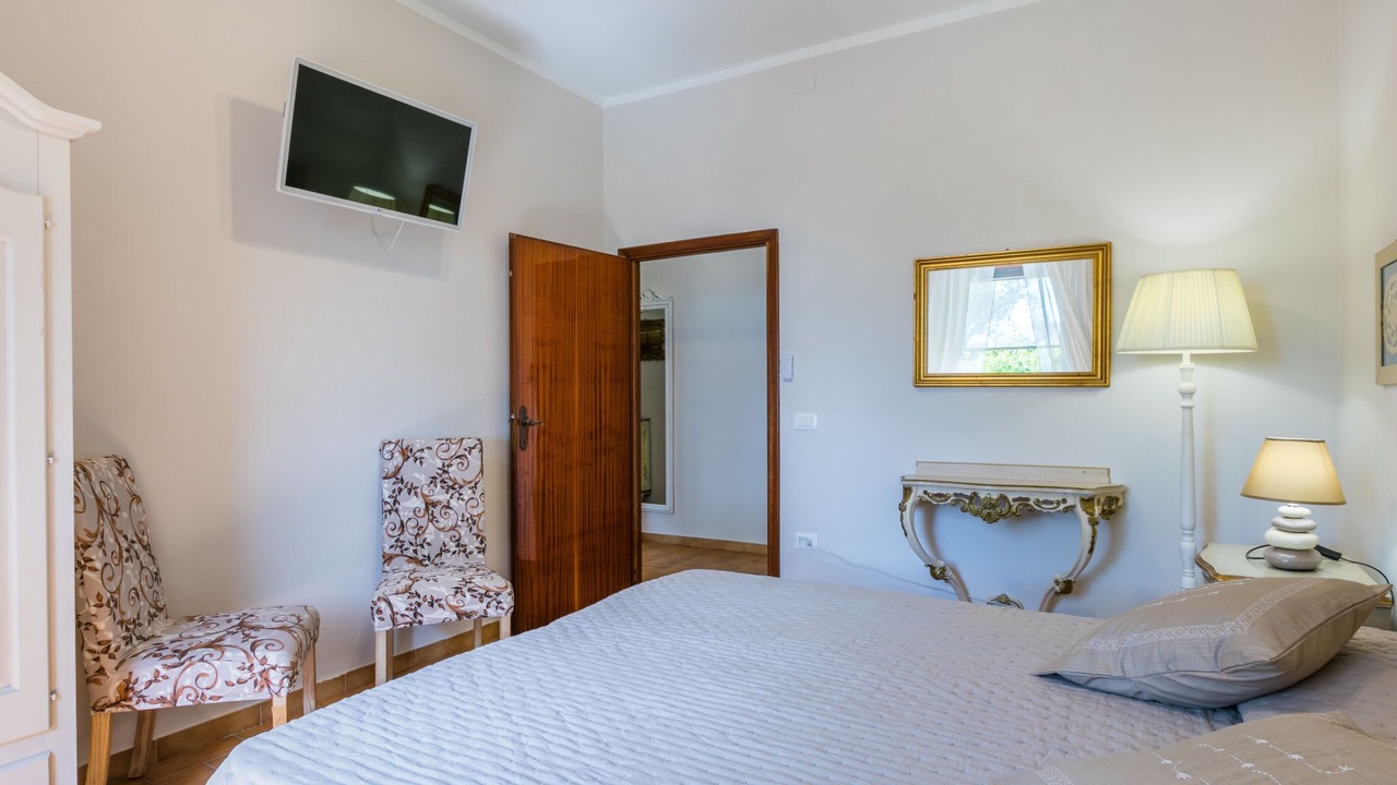 "Casalvecchio", 3-room apartment 55 m2 on 1st floor. Spacious and bright, beautiful and modern furnishings: upper floor: (exterior staircase) living/dining room with satellite TV. Exit to the terrace. 1 room with 1 bed, 1 double bed and satellite TV. 1 double bedroom with satellite TV. Open kitchen (mini-oven, oven, dishwasher, 4 induction hot plates, toaster, kettle, microwave, electric coffee machine) with dining table. Exit to the terrace. Shower/bidet/WC. Electric heating, gas heating, air-conditioning. Heating available only from 10.10. to 19.04. Large terrace 40 m2, roofed. Terrace furniture, sitting area. Beautiful distant view of the sea and the countryside. Facilities: safe, mosquito net, children's high chair, baby cot for up to 2 year olds, hair dryer. Internet (WiFi, free). Please note: maximum 1 pet/ dog allowed. Fire extinguisher. terrace shared with another apartment. IT050006B5LNZZD6VU