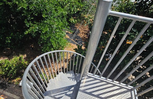 There is a spiral staircase leading up to the 2nd floor. There are flood lights if you come in at night that will illuminate your path.