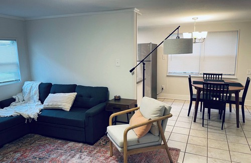 Cozy 1/1 detached guesthouse with full kitchen, living room, and 1 bedroom with an attached bathroom. Property has a large backyard and pets are allowed (for a small pet fee) but should be leashed if out. Please indicate if you will be bringing pets. No shared spaces outside of laundry and outdoor space and apartment has its own entrance. Property is located in the Hourglass District. 10 minutes from Amway Center, Camping World Stadium and downtown.