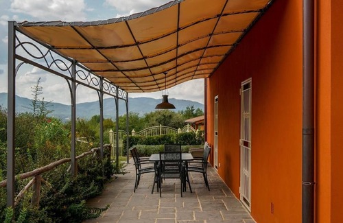 On top of one of the knolls, enjoying the view over the Tuscan hills, are 2 buildings, one hosting 4 self-catering flats, each with private entrance and outdoor space, and the other an independent accommodation. In the other direction there is an independent house with private garden and hot tub and another building with apartments. The flats are located at 150 m from the swimming pool area. All flats have a common laundry room and a large barbecue to share.