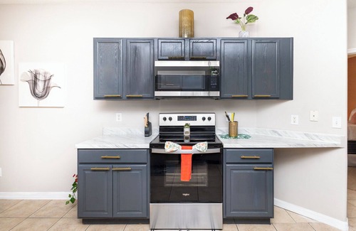As you step into this luxurious home, you're greeted by a spacious and elegantly decorated living area complete with comfortable seating, a large smart TV, and plenty of natural light filtering in through the expansive windows. The open floor plan seamlessly transitions into the fully equipped kitchen, where preparing meals for the family is a delight assisted by stainless steel appliances, ample counterspace, and sleek cabinetry stocked with all the comforts of home. Enjoy a spread of appetizers while seated up at the counter or gather everyone around the chic dining table to socialize over a delicious homecooked meal. More fun times can be made in the garage-converted game room, where you can lose yourself in the pages of a good book or crank up the competition at the foosball table.