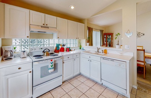 The primary bedroom will quickly become your own oasis with its effortless patio access and spa-like en suite bathroom. Indulge in bubble baths in the soaking tub and apply a face mask in front of the dual sinks. The additional bedrooms are just as lush with their high-quality linens, vibrant pops of color, and central air-conditioning. For your convenience, utilize the home's separate washer/dryer.