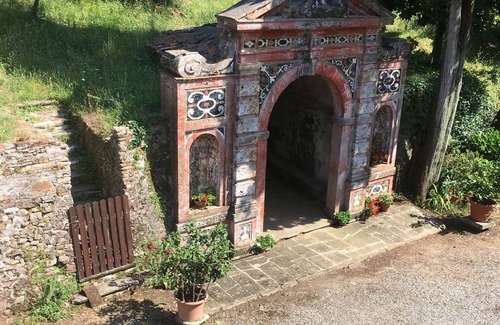This villa, present and widely described in all the publications concerning the historic houses of Lucca, was built in the seventeenth century in a dominant place the village of Vorno, not far from the destroyed medieval fortress from which the counts of Montezano, as lords of the country, administered this place. It is accessed via cobblestone road built for the passage of the carriages of ancient times. The place is also famous for its beneficial waters and is located in a green valley whose landscape and context create a harmony repeatedly emphasized by several writers and poets. This was one of the territories preferred by the aristocrats who ruled Lucca until the nineteenth century and who built their most beautiful homes here. This villa, with the noble coat of arms of the aristocratic family who built it and who lived there, has a very large scale with a pavilion that leads into a large hall from which you can enjoy a breathtaking view overlooking the city of Lucca and its ancient towers. The rooms show, in part, some frescoes and the nymphaeum, hollowed in the overlying hill, still owned, further qualifies the noble characteristic of the villa. The kitchen on the ground floor, with access to the park and the pool below, is full of testimonies of the era and as in the nymphaeum it makes you enjoy, especially in summer, a cool temperature. The swimming pool, which can be accessed by descending from an ancient stone staircase, has gazebos, is fully equipped and is located in a large park that guarantee peace and privacy.