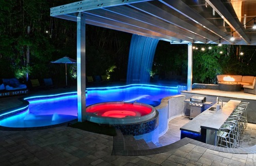 This property boasts a pool with dual pumps, 3 bedrooms with comfortable beds, and a fully functional kitchen. Step into the backyard oasis featuring a resort-style pool with water features, an 8-person hot tub with a swim-up bar, and a breathtaking waterfall effect. The outdoor kitchen, complete with a natural gas grill, ice machine and fridge, is perfect for entertaining. The house is equipped with a tablet to control the pool futures.