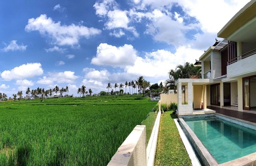 Located in the Ubud area, builds for the guest who admire tranquility, RC Ubud Villas are a perfect choice for spending your holiday. Each villa has an outdoor swimming pool with a wide view of rice field. From the entrance you can feel Balinese sense in the air, enjoy the tropical atmosphere from the landscape. The RC Ubud Villas comes with living room, each bedroom with private bathroom attached, kitchen completed with appliances and cutlery. Enjoy the breeze of morning air at the terrace or balcony. Feel swimming with a view of rice field beside you, and even you can relax in the pool end lounge while enjoying the sunrise or sunset.