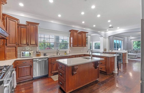 Close to Disney, Universal, Legoland, Sea World Theme Parks, Kennedy Space Center and Beaches. Features a chef’s kitchen with wet bar, dining room, office, game room complete with separate bar, poker, ping pong and air hockey tables, arcade machine with Pac-Man, Galaga, as well as many other 80’s games, and Karaoke. Over-sized pool, hot tub with patio and BBQ grill, shaded kids’ playground with sandbox, soccer goal, campfire area, basketball hoop and independent movie room. The workout room includes dumb bells, kettle bells, tension bands, punching bag with gloves, and yoga mats. 2 Master suites . Ample parking for big groups. Join us for an amazing and excellent vacation stay with your family and friends.