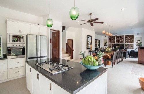 Spacious open plan living area with a clean contemporary feel, large sofas around a central coffee table, with expansive solid wood folding doors opening back to reveal the pool area. For your enjoyment there is a 60” flat screen television having international satellite reception, giving over 60 stations. Along with a full surround sound system. Inclusive WIFI means that you can jump online at any time. We have plenty of adapter gang’s for use whilst you are with us.