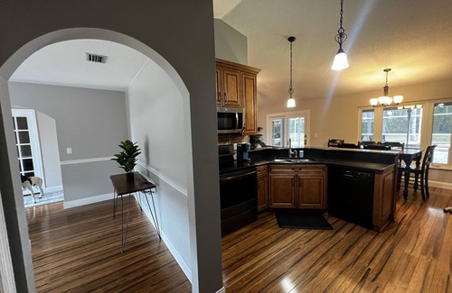Over 1000 sq ft of screened-in pool and patio area! Ready for you to soak up the sun, relax throughout the duration of your stay, no matter the weather! Huge back yard to stretch your legs, or play some yard games. All of this surrounded by a private fenced in back yard, and a house that is very accommodating!
