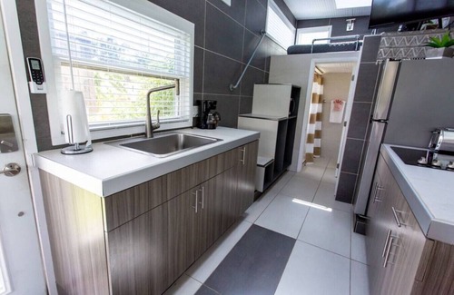 Just because it's a tiny house doesn't mean you have to skimp on style! With an open floor plan and high ceilings, this tiny home is filled with light and air. The Ritz has high-end finishes, including a full-size, stainless steel fridge, glass stove cooktop and Italian tile throughout. Your tiny house stay won’t be a tiny experience...relax and unwind, enjoy sunrise yoga by the lake, and use our amenities to fish, kayak, and explore the natural beauty of Orlando!