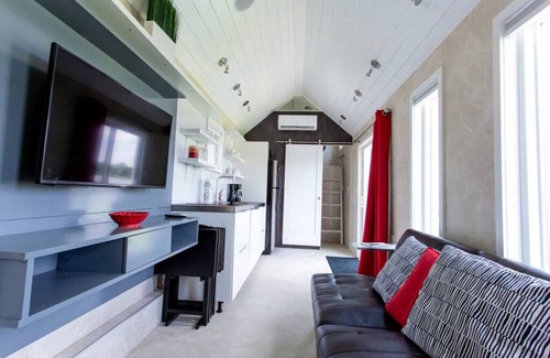 When you walk in you will notice a very spacious kitchen and living room with floor-to-ceiling stone and marble! There's a large flat screen TV in the living room with a floating bedroom with a queen size bed to the left. On the other side of the house is a loft bedroom with a twin size bed (only big enough for children - the length of the loft is only 5’6”). The bathroom has a large shower and a washer and dryer combo unit, a regular toilet (not compost) and a bathroom sink. This tiny house is a unique once in a lifetime experience! The pictures don't do justice.