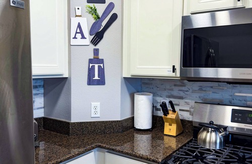 Cook in style in a modern kitchen with high-end appliances, including a gas stove, stainless steel dishwasher, blender, toaster, and microwave. Start your day with the perfect cup of coffee from the Keurig K-Cup machine.