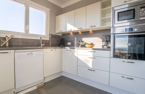 6-room house 175 m2 on 2 levels, south facing position. Fully renovated in 2016, comfortable and modern furnishings: large living/dining room with panoramic window with 1 folding bed (90 cm, length 190 cm), dining nook, TV, flat screen and fan. Exit to the balcony. 2 rooms, each room with 1 french bed (1 x 160 cm, length 200 cm), fan. Kitchen (oven, dishwasher, 4 ceramic glass hob hotplates, toaster, microwave, freezer, electric coffee machine, Capsules for coffee machine (Senseo) extra). Exit to the terrace. Shower, sep. WC, double hand-basin. Heating. On the lower ground floor: living/dining room with 1 folding bed (90 cm, length 190 cm), TV, flat screen and fan. Exit to the garden, to the terrace. 2 rooms, each room with 1 french bed (1 x 160 cm, length 200 cm), fan. Open kitchen (oven, dishwasher, 4 induction hot plates, toaster, kettle, microwave, freezer, electric coffee machine) with dining nook. Shower, sep. WC, double hand-basin. Heating. Balcony, terrace 8 m2, terrace 6 m2. Terrace furniture, barbecue, deck chairs (10). View of the sea. Facilities: washing machine, dryer, iron, mosquito net. Internet (WiFi, free). Parking (4 cars). Please note: 1 small pet/ dog allowed. TV only FR. Smoke alarm. No internal connecting door between the floors. FJS1078HT