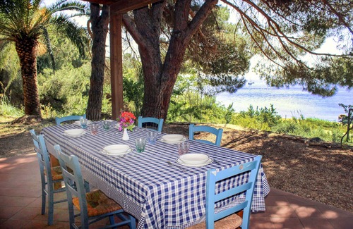 The villa is in the Tuscan Archipelago National Park, surrounded by a private garden of Mediterranean scrub; centuries-old pine trees, olive trees, eucalyptus trees, oleanders, prickly pears, rosemary, almond trees and strawberry trees..