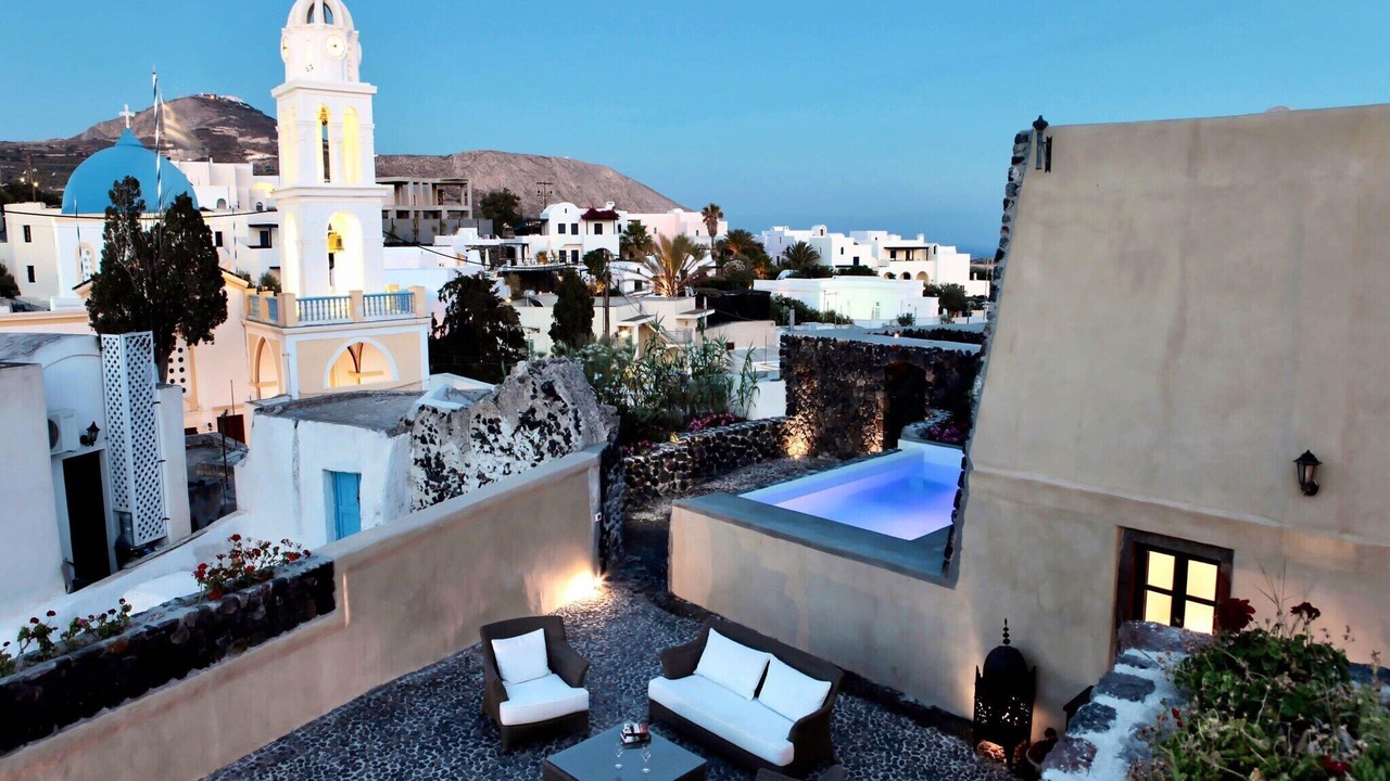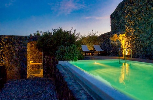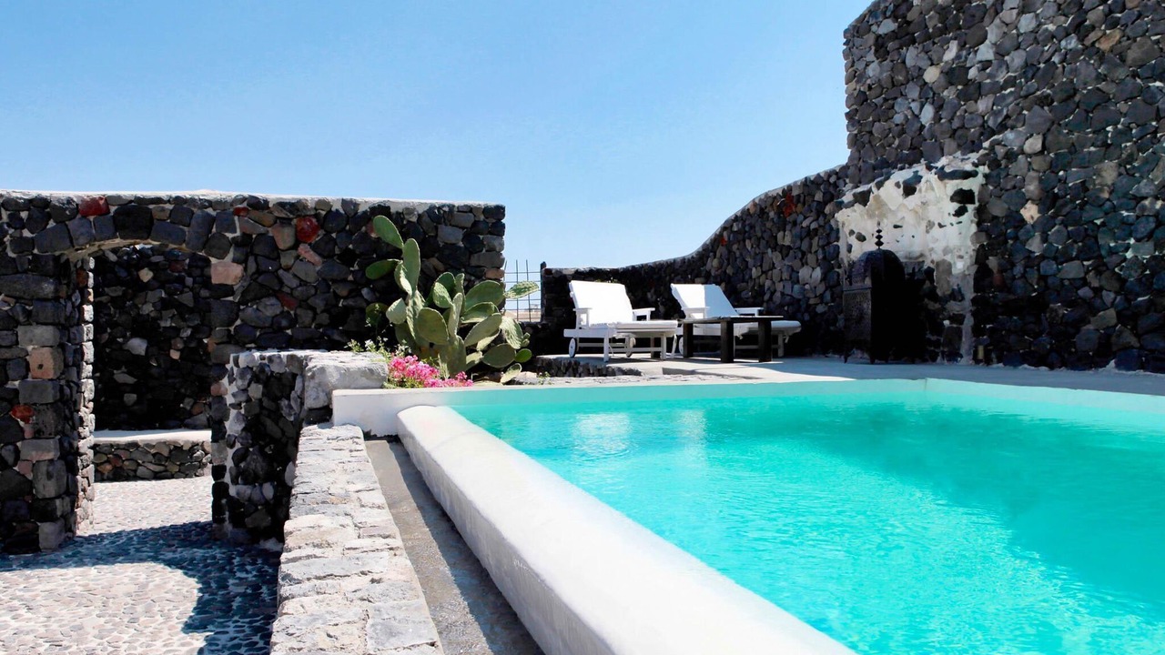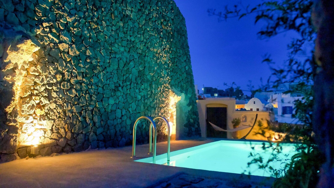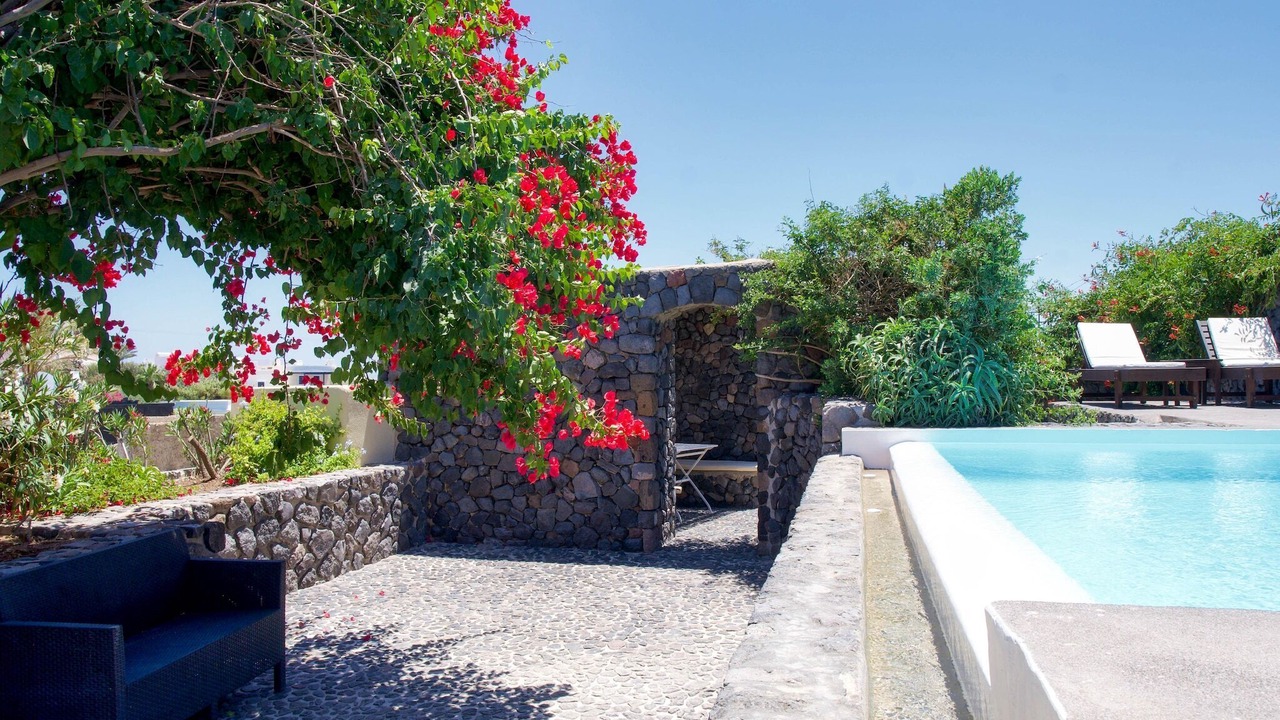 The villa also offers a private swimming pool (4 x 3 m), open from April to October. It is just 8 km from the sea, with restaurants only 100 meters away and general supplies within 200 meters. The lively center of Santorini and nightlife are 9 km away, with public transport nearby.