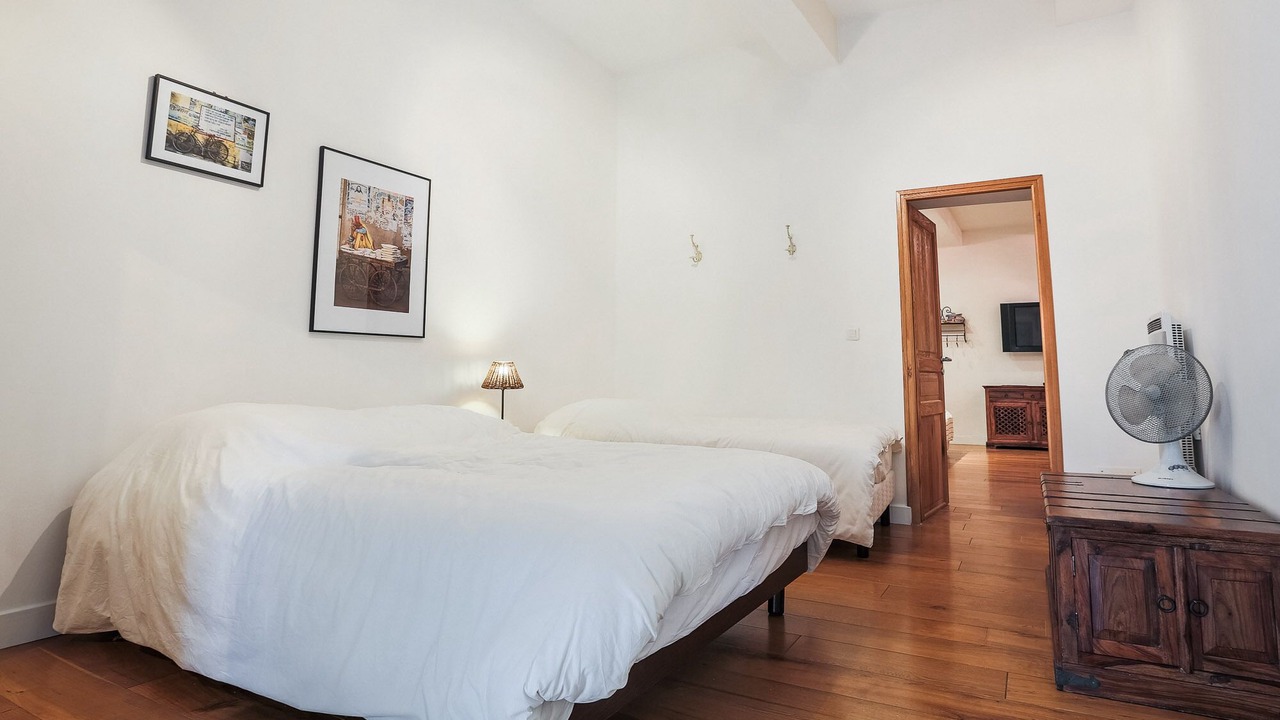- 1st bedroom : 1 double bed + 1 single bed + 2 cupboard + 1 desk + 1 fan