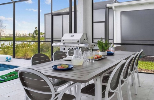 When the weather is right (basically always), pop open the patio door to your private outdoor oasis, featuring a crystal blue pool, comfy loungers, a patio table and chairs, and a grill. Shift the vibe from chilled to fired up with some friendly competition at the ping pong table, putting green, and poolside basketball hoop!